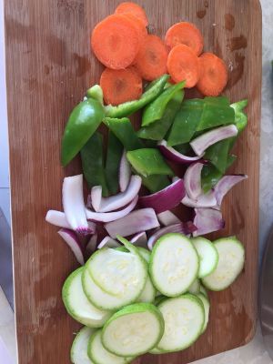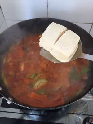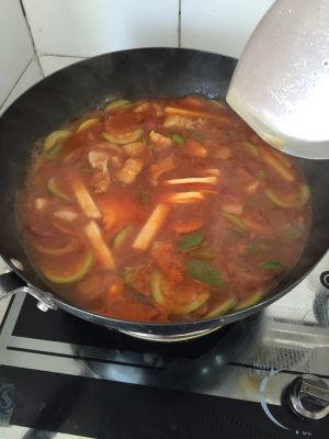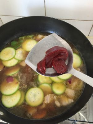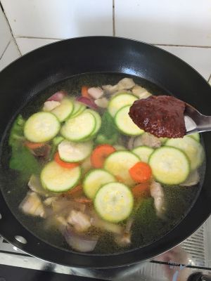 加入水,最好是高汤,烧开后,加入蔬菜,放入酱