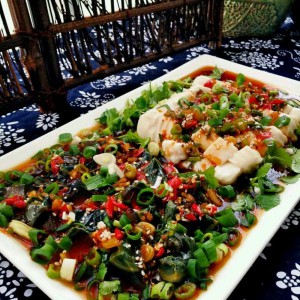 将一半葱花,线椒,榨菜,剁椒酱,生抽,玫瑰醋,麻油,白糖,红油,芝麻混合成料汁