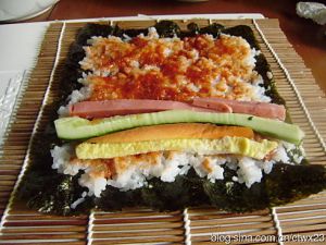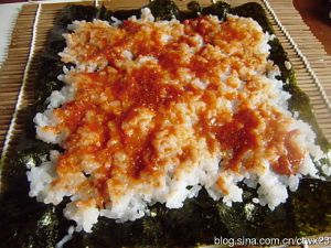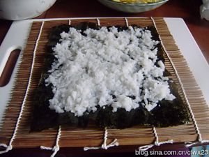 寿司帘铺开,放上海苔