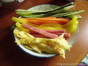 黄瓜洗净去二头切细条;胡萝卜洗净去根部切细条;方腿肉切细条;蛋皮先摊好,冷却后切细条;日本大根取出(我买来就是切好的)
