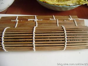 然后拖下来一些,用寿司帘裹住