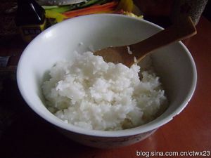 象平常一样煮饭(水略少一点点)。煮好饭以后大约过二十分钟,趁热取出倒入寿司醋(多少依各家口味而定)
