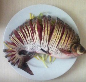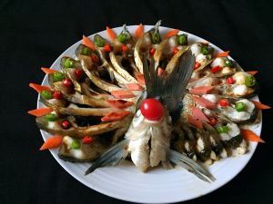 将油和蒸鱼豉油均匀的淋在鱼身上,将小米椒分前后摆在鱼身上,胡萝卜摆盘边,火腿肠装饰。美味的孔雀开屏鱼快来品尝吧。