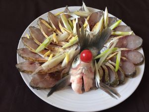 腌制好的武昌鱼在铺好葱花姜丝的盘子上一片一片鱼肉分开,排出孔雀开屏的造型,鱼头从下颌处劈开,不要断,立于鱼身,尾巴稍微处理挨着鱼头码好