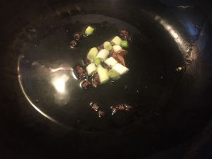 锅中热油,油热加入八角,花椒,葱炒香,过滤掉杂质留油