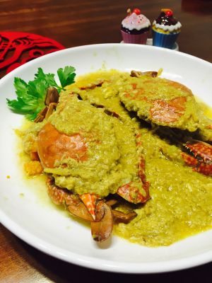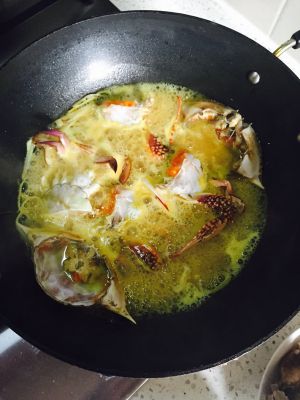 咖喱都融化以后把螃蟹放进去继续煮熟,拆的块越小越入味,但我还是喜欢吃些蟹肉,所以只是对半切的