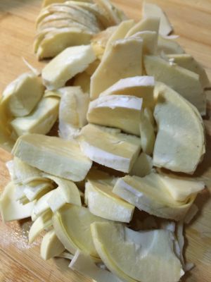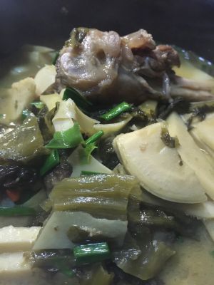 放盐,鸡精,生抽调味再炖七八分钟,最后味正了放蒜苗碎碎。吃起来笋脆,汤鲜、香,味道不是一般的好。