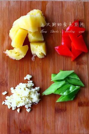 将菠萝、苦瓜、彩椒改刀,大蒜切末