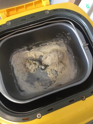 所有材料除了黄油芝士榴莲全部放面包机。启动和面程序