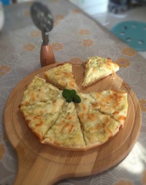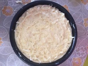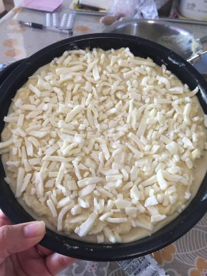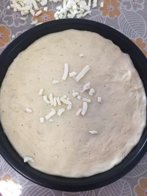 面团进行第一次发酵成两倍大。。直接按压在披萨盘里。。摊开。。中间薄边缘厚。。戳些小洞