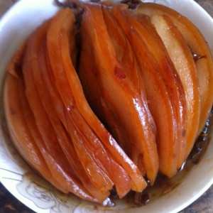 煮成后,凉透,放入冰箱冷冻一个小时,这样是为了切肉时,不会切坏