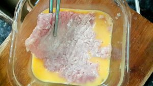 鸡蛋打散,将猪扒双面蘸上蛋液。