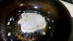 热锅凉油,待油温升大7层热,炸猪扒直至双面金黄。