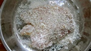 蘸好蛋液把猪扒双面拍上面包糠。多拍两下,使面包糠均匀牢固的粘在猪扒上。