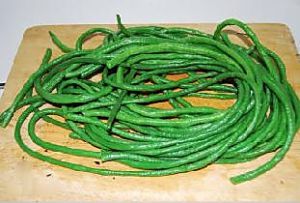 把豇豆洗净焯水。(放入少量盐和花生油,使之入味和颜色鲜亮。)