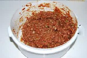 肉馅在案板上剁一会儿,中间放入适量的盐。然后盛入容器中,放入适量花生油(使肉馅儿更紧实)、老抽、酱油、少量料酒和五香粉顺着一个方向搅拌,上劲儿后放置一会使之入味。