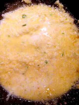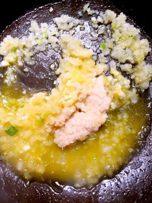 放入洋葱碎翻炒至透明,加入剁好的蒜泥继续翻炒。
