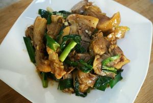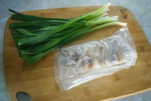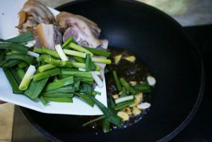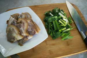 蒜苗切成小段,我买的是卤猪脸提前切好的嫌大块可以改刀,本人喜欢大快朵颐就这样子了