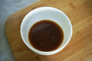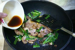 开火炒之前先来调碗汁,把水和白糖,酱油,鸡粉倒入碗中混合备用【因为卤猪脸本身就是熟的蒜苗也是很容易熟,如果炒的时候再一样一样的加会导致太过软烂】