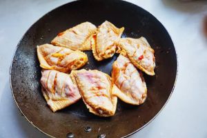 鸡翅从腌料中捞出直接放入平底锅,不用怕没有油干,煎一会儿就出鸡油了。