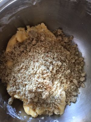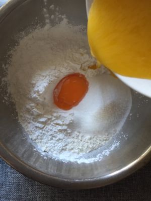 面粉类里加入一个鸡蛋黄,黄油混合液 搅拌均匀