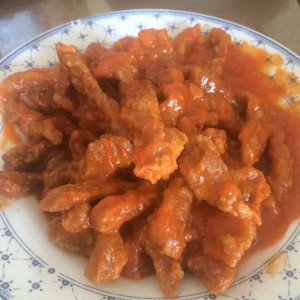 將肉裹上干淀粉下油锅炸(炸两遍酥脆)