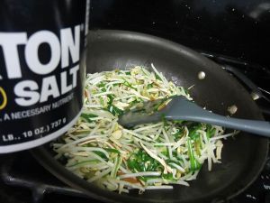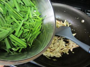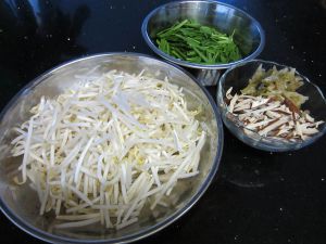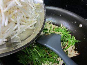 准备好食材。豆芽菜摘去根洗净,韭菜切成寸段,豆干切丝或片。