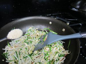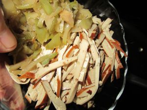 油温热后,倒入豆干和榨菜丝煸炒一下。