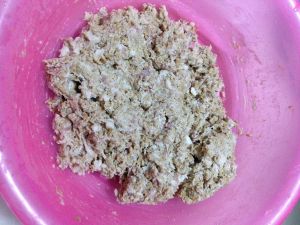 把所有食材放进脸盆(厨房装食物专用大盆)用手搅拌均匀,把蕃薯粉装进碗里加适量水泡湿搅拌均匀后再倒进食物中搅拌均匀。