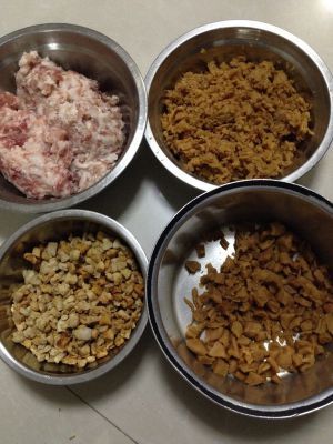 准备好材料,菜脯切丁再用搅拌机搅碎。猪油渣搅碎,猪肉切丁剁碎(猪肉用手剁有小丁块口感更好)