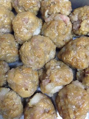 把搅拌好的食物做成丸子,要注意做丸子的时侯先把丸子抓紧实再做成圆形。丸子做好后放在大盘子里,上锅蒸二十分钟即可。