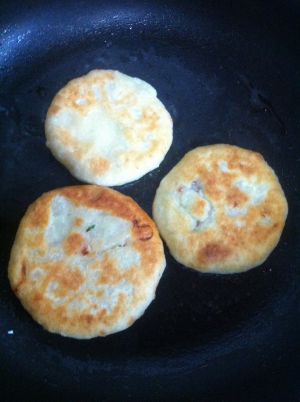 放入平底锅内中小火用油煎两面金黄即可,因为烫面,很容易熟,注意别糊了。