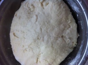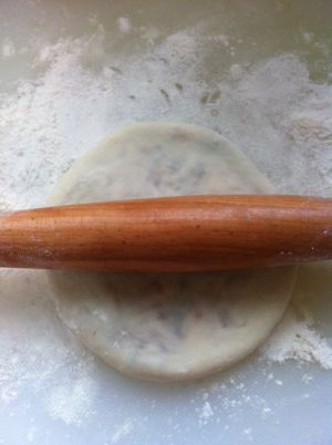 收口朝下,用擀面杖小心浮在上面朝四周擀平,也可以用手扑些面粉压平,别弄破了,轻轻即可。
