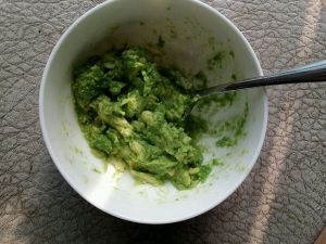 牛油果对半切开,去核,用勺子把果肉挖出来,搅成泥