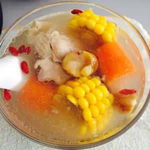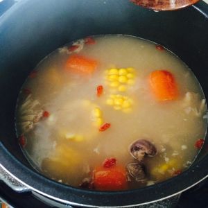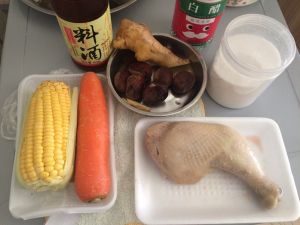 再重新煮一锅水,这一步把鸡腿,玉米,萝卜,栗子放进去,加点料酒,高压45分钟。