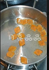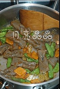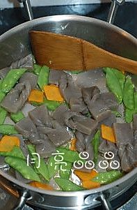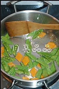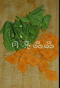 荷兰豆洗净摘去两头,当中切一刀。胡萝卜洗净去皮切成片。