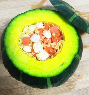 小碗南瓜一个,顶部切开如一个盖子,去掉里面的囊和南瓜籽