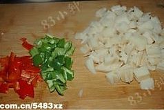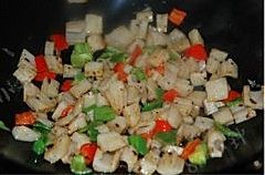 下入青红椒丁,炒至断生后,加少许盐调味即可起锅。