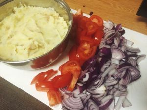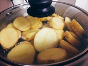 土豆切厚片大火蒸熟(因为不想切丁随汤熬煮⋯⋯)