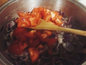 随后下番茄,炒软后加水,约600ML,根据食材的量决定
