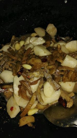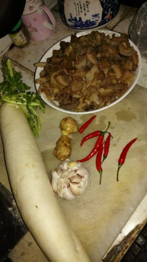 萝卜切块,姜切片,大蒜剥皮,辣椒切好,起锅放适量油,油热放所有香料(姜、大蒜、辣椒、干辣椒、花椒、八角、桂皮)爆香后放入牛杂下锅炒,大概炒两三分钟放入料酒,生抽,胡椒粉,稍炒片刻放入切好块的白萝卜,一起炒。