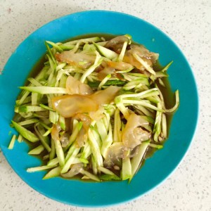 黄瓜和海蜇都切成丝,蒜拍碎切块,加入适量的所有调味品,加入蒜末,拌匀即可!