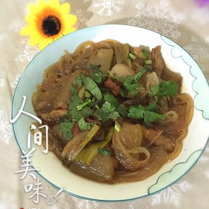 放入粉条,倒入清水,水自己掌握哦,把粉条压在底层哦,锅里上气后继续炖10分钟,粉条熟了就可以了