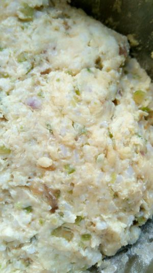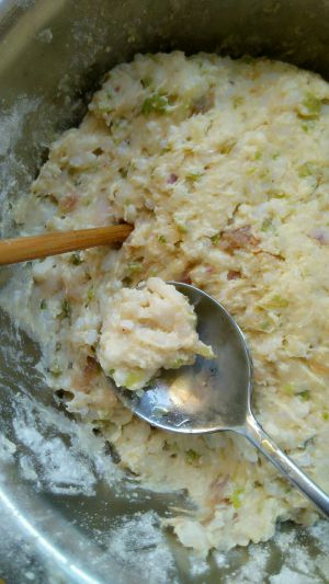 把剩米饭,羊肉馅是做馅饼剩的,不用放各种调料子,加点面粉,和在一起,放二十分钟