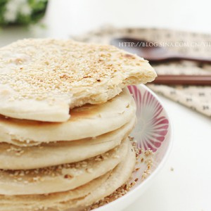 材料:面粉300g.滚水120g.冷水100g.猪油25g.白芝麻适量