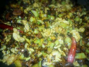 倒入你曾经喜欢的但现在却厌倦了的酱料进锅,搅拌,炒匀,略加料酒和水,将香菇煮熟后,最后加入榨菜末,调匀即可关火,以保留榨菜的脆感。