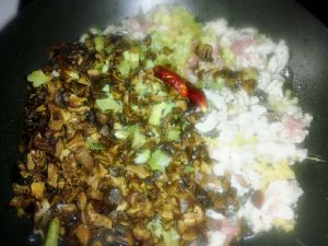 在锅里放多些油,先猪肉糜和生姜末,后香菇末一起翻炒到肉糜变熟。