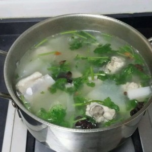 放盐,香油,香菜…冬瓜排骨汤出锅…