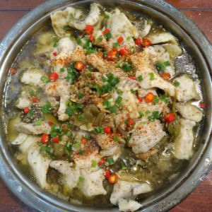 将鱼片铺在表面,浇汤,根据个人口味撒入辣椒面、葱花、白芝麻