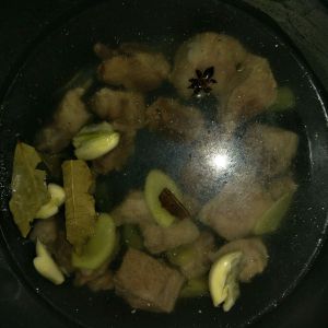 捞出来焯好的排骨,加姜片、香料、水开始煲汤